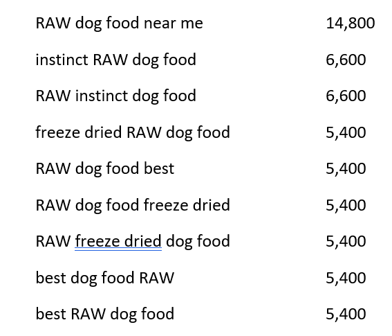 I collected nearly 800 keywords that are directly tied to the word “raw dog food” and if you look at the sample I have here in this image, you can see that the search numbers are pretty high.